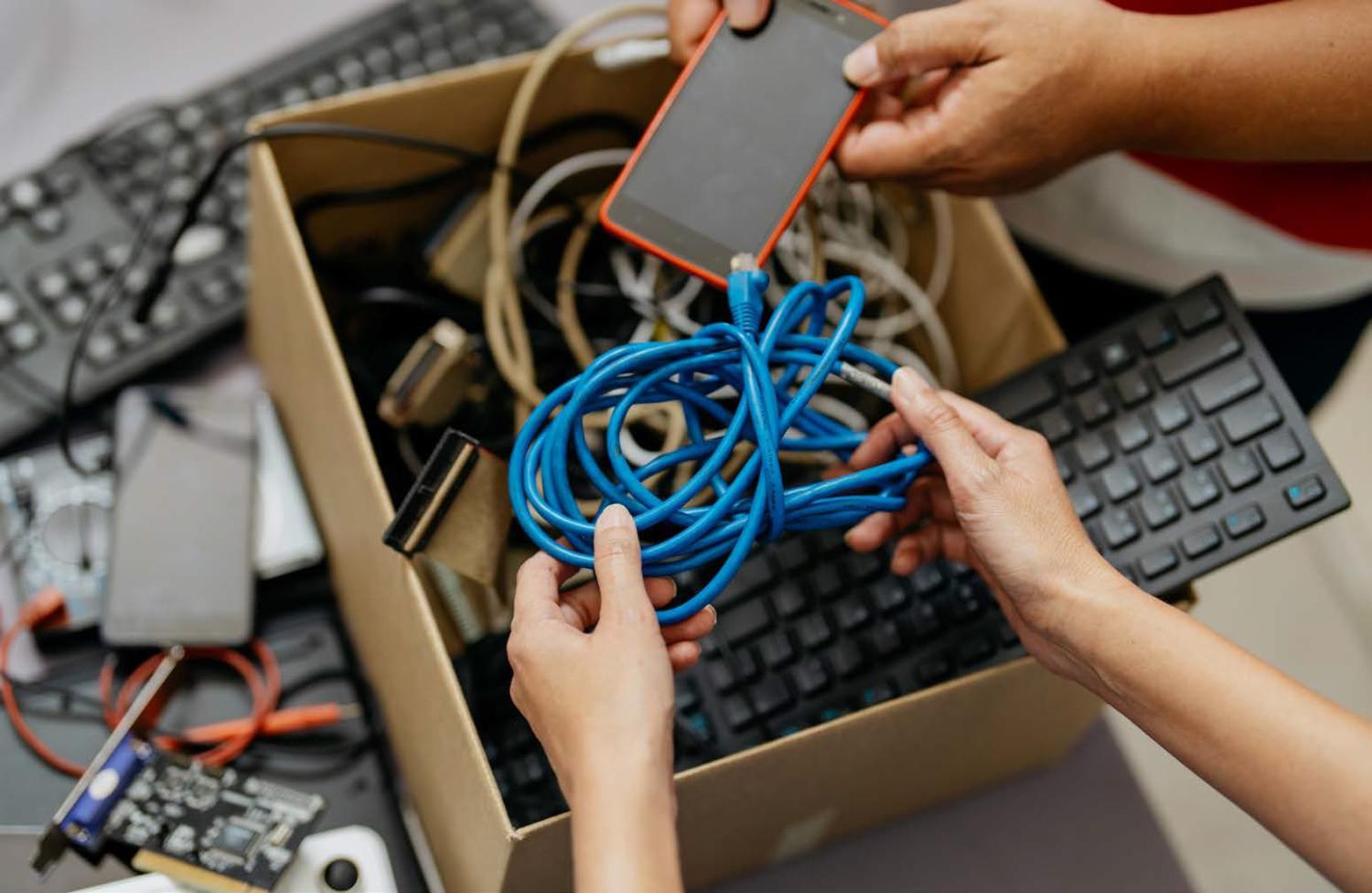 At participating locations, teams set up e-waste collection bins, which accept broken and unwanted electronics including cellphones and tablets, cables and chargers, ink cartridges, and more. Tenants and visitors can easily drop off their devices in one of the secure bins, while embedded sensors track the contributed items.